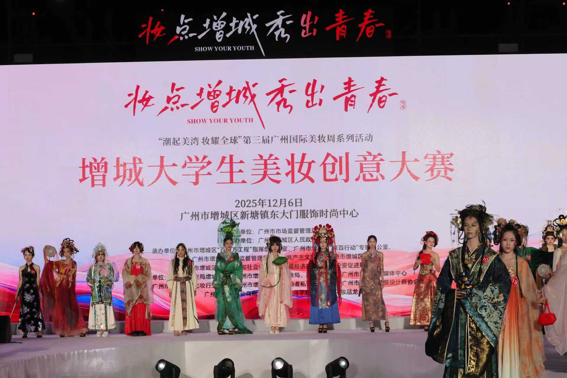 作为“美妆周”的亮点,“增城大学生美妆造型创意大赛”吸引了增城区内8所高校、20支队伍参与角逐21个奖项。大赛以“古韵今风”为主题,鼓励青年学子将传统文化元素与现代美妆技艺创新融合。舞台上,模特们以精湛妆造技艺演绎国风之美,展现了增城青年卓越的创意才华与文化自信。